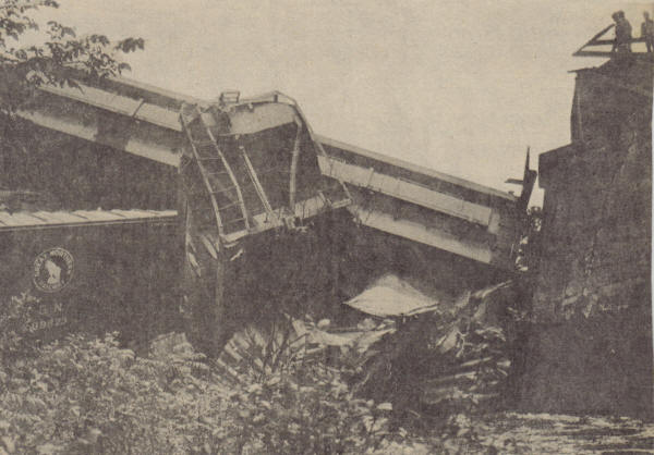 On either side evidence of the spectacular train wreck is in evidence. Hulks of damaged boxcars are strewn along the right-of-way near the creek area. The 30-foot-deep chasm on which freight cars tumbled, one after another, removed to a stock-piling area north of the track in a clean field. Pallets of lumber also have been salvaged; but the salvage work was only partially done.