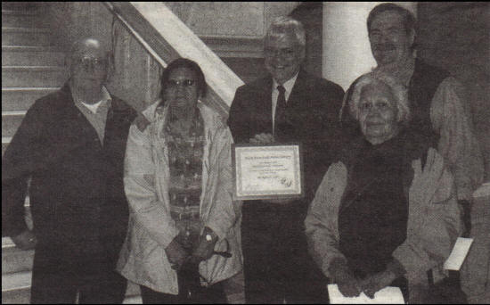 State Historic Preservation Officer Michael Stevens (third from left) presents a certificate to Eugene Gutknecht, (left) president of the Jackson County Historical Society. Also in the photo are Gary Morris, Leona McKee and Lila Blackdeer.