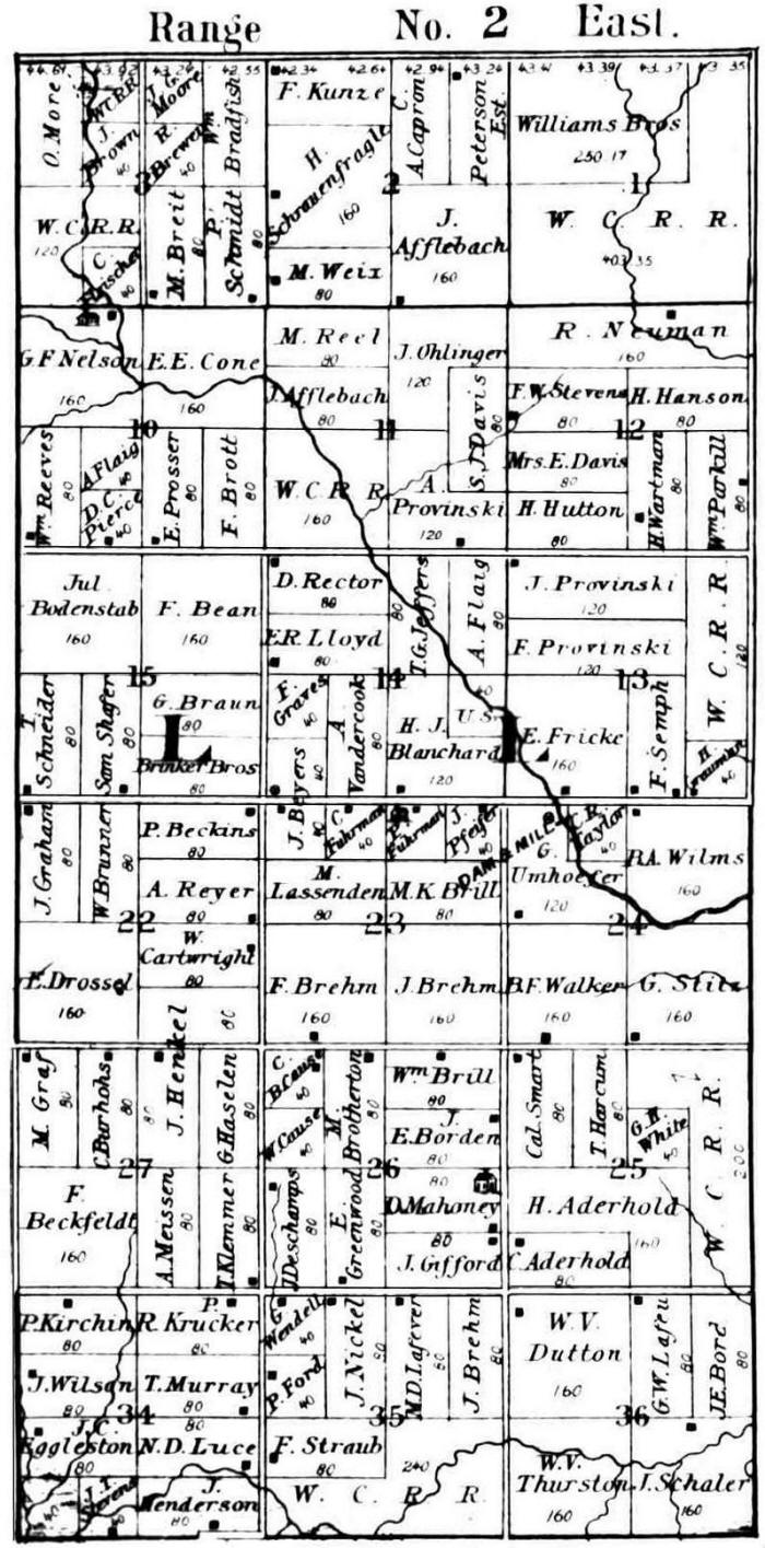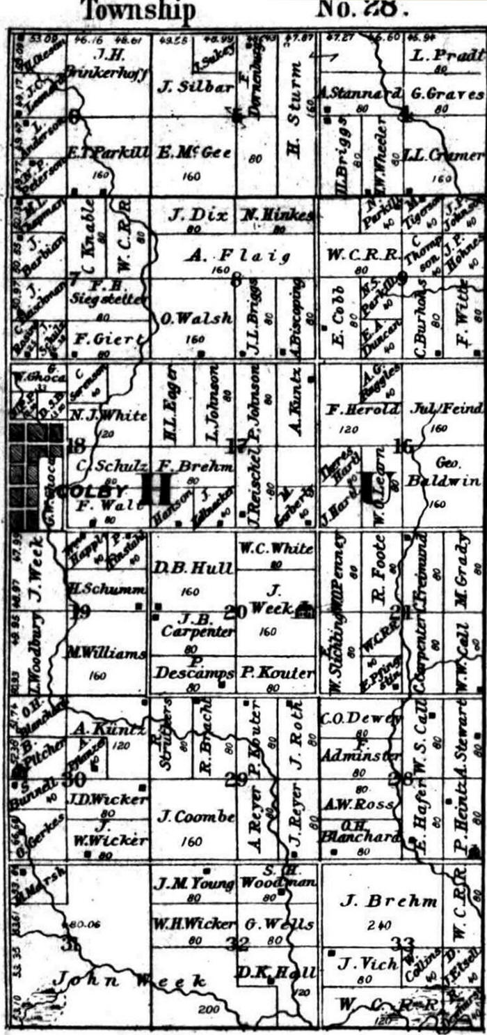 Hull Twp 28 N Range 2 East, Marathon County, WI By SECTION 1. Williams Bros. 250.17; W.C.R.R. 403.35 2. F. Kunze; C. A. Capron; Peterson Est.; J. Afflebach 160; M. Weix 80; H. Schrauenfragle 160 3. O. More; W.C.R.R.; J. Brown 40; J. G. Moore; Wm. Bradfish; R. Brewer 40; P. Schmidt 80; M. Breit 80; C. Fleischer 40; W.C.R.R. 120 4. H. Sturm; A. Stannard 80 (Ansel Stannard); L. Pradt 80; G. Graves 80; L. L. Cramer 160; H. W. Wheeler 80; J. L. Briggs 80 5. J. Silbar; L. Sukey; F. Dornenburg (Fred Doernenburg); H. Sturm 160; J. Silbar 80; E. McGee 160 6. H. Oleson; J. C. Leonard; J. H. Brinkerhoff; E. T. Parkill 160; N. P. Peterson; L. Anderson 7. M. L. Chapman; J. Barbian; C. Knable 80; W.C.R.R. 80; F. B. Siegstetter 80; F. Giert 80; J. Schulz; C. Rosin; J. Fleischman 8. J. Dix 80; N. Hinkes 80; A. Flaig 160; A. Biscoping 80; J. L. Briggs 80; O. Walsh 160 9. 40; N. Parkill 40; W.C.R.R. 80; M. Tigerson 40; J. P. Johnson 40; J. P. Hohnes 40; C. Thompson 40; F. Witte 80; C. Burhohs 80; E. A. Duncan 40; N. S. Parkill 40; E. Cobb 80 10. G. F. Nelson 160; E. E. Cone 160; F. Brott 80; E. Prosser 80; Wm. Reeves 80; A. Flaig 40; D. C. Pierce 40 11. M. Reel 80; J. Afflebach 80; J. Ohlinger 120; S. J. Davis 80; A. Provinski 120; W.C.R.R. 160 12. R. Neuman 160; F. W. Stevens 80; H. Hanson 80; Wm. Parkill 80; H. Wartman 80; Mrs. E. Davis 80; H. Hutton 80 13. J. Provinski 120; F. Provinski 120; W.C.R.R. 120; H. Graumar 40; F. Semph; E. Fricke 160 14. D. Rector 80; E. R. Lloyd 80; T. G. Jeffers 80; A. Flaig 80; U. S 40; H. J. Blanchard 120; A. Vandercook 80; J. Beyers 40; F. Graves 40 15. Jul Bodenstab 160; F. Bean 160; G. Braun 80; Brinker Bros 80; Sam Shafer 80; T. Schneider 80 16. F. Herold 120; A. G. Raggles 40; Jul Feind 160; Geo. Baldwin 160; W. O. Learn 80; J. Hartl; Theres Hartl 40 17. H. L. Eager; L. Johnson 80; P. Johnson 80; A. Kuntz; M. Garberly 40; J. Reischel 80; J. Idlnacker 40; Hartson; F. Brehm 80 18. G. W. Ghoca 33; VIP.P; D. S. B. 13.50; (Town of Colby); C. Sorenson 40; N. J. White 120; C. Schulz 80; F. Walt 80; G. W. Ghoca; (Town of Colby) 19. J. Week; Wm. Happl 40; P. Finstahl 40; H. Schumm; M. Williams 160; L. Woodbury 20. D. B. Hull 160; W. C. White 80; J. Week 160 (SCHOOL?); P. Kouter 80; P. Descamps 80; J. B. Carpenter 80 21. W. O. Penney 80; R. Foote 80; C. Freimund 80; M. Grady 80; W. W. Call 80; C. Carpenter 80; E. Pfingstin 40; W.C.R.R.; E. W. Slichting 80 22. J. Graham 80; W. Brunner 80; P. Beckins 80; A. Reyer 80; W. Cartwright 80; J. Henkel 80; E. Drossel 160 23. J. Beyers 40; C. Fuhrman 40; M. Lassenden 80; P. Fuhrman (SCHOOL?); J. Pfeifer 40; M. K. Brill 80; J. Brehm 160; F. Brehm 160 24. G. Umhoefer 120 (DAM & MILL); C. R. Taylor 40; B. A. Wilms 160; G. Stitz 160; B. F. Walker 160 25. Cal Smart 80; T. Harcum 80; G. H. White 40; W.C.R.R. 200; H. Aderhold 160; C. Aderhold 80 26. C. B. Cause 40; W. Cause 40; M. Brotherton 80; Wm Brill 80; J. E. Borden 80; D. Mahoney 80 (SCHOOL?); J. Gifford 80; E. Greenwood 80; J. Deschamps 80 27. M. Graf 80; C. Burhohs 80; J. Henkel 80; G. Haselen 80; T. Klemmer 80; A. Meissen 80; F. Beckfeldt 160 28. C. O. Dewey 80; F. Adminster 80; W. S. Call 80; A. Stewart 80; P. Heintz 80 (SCHOOL?); E. Hafer 80; O. H. Blanchard 80; A. W. Ross 80 29. R. Struthers 80; R. Bracht 80; P. Kouter 80; J. Roth 80; J. Reyer 80; A. Reyer 80; J. Coombe 160 30. O. H. Blanchard; B. Pitcher (SCHOOL?); A. Kuntz 120; A. Pflanzer 40; J. D. Wicker 80; J. W. Wicker 80; O. Gerkes; S. Bunnell 40 31. H. Marsh; John Week 480.06 32. J. M. Young 80; W. H. Wicker 80; S. H. Woodman 80; G. Wells 80; D. K. Hall 120; John Week 200 33. J. Brehm 240; W.C.R.R. 80; W. Collins 40; D. J. Etsell 40; R. Dewhurst 40; W.C.R.R. 120; J. Vich 80 34. P. Kirchin 80; J. Wilson 80; P. R. Krucker 80; T. Murray 80; N. D. Luce 80; J. Henderson 80; J. T. Stevens 40; 40; J. C. Eggleston 80 35. G. Wendell 40; P. Ford 40; J. Nickel 80; M. D. Lafever 80; J. Brehm 80; W.C.R.R. 240; F. Straub 80 36. W. V. Dutton 160; G. W. Lafeu 80; J. E. Bord 80; J. Schaler 160; W. V. Thurston 160