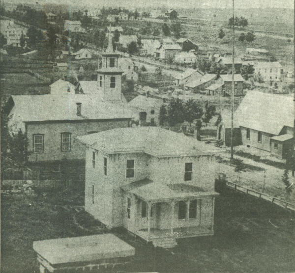 A view captured from top of the old court house, looking southwest, circa 1880. The large white house in the foreground is now offices of the Johnson, Sautebin & Indeberg Law Firm. Behind it is the first Methodist Church building that was destroyed by fire in the mid 1890’s. Across the street, west, is the Episcopal Church building, now Rural Insurance office and Voigt residence. The road in background view is Hewett Street.