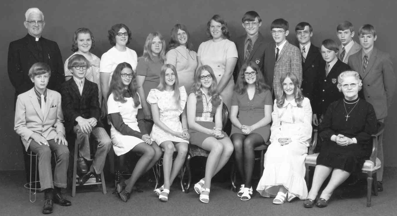 The Class of 1972, the last eighth grade to complete St. Mary’s School. From the left, front: Patrick Poziombke, Dennis Langreck, Carla Zilk, Patricia Tibbett, Janell Ross, Sally Zilk, Kathryn Mrotek, Sister Valerie. Back: Father Brady, Kathleen Bedell, Toni Langreck, Angela Statz, Linda Brey, Bridget Burr, Gary Foster, Dale Pfeiffer, James Skroch, Peter Langreck, Mark Heiman, Michael Marshall. |