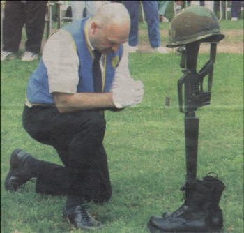 Having completed erecting the official display paying tribute to the “Fallen Soldier”, Don Simpson, of the American Legion Post in Neillsville, kneels in prayer.