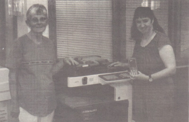 Elsabeth Johnson (l) of the Neillsville Ara Library Foundation and JoAnn Gustavson of the Neillsville Public Library display the new copier/printer/scanner purchased with foundation funds donated to the Library. Gustavson holds a hand-held barcode scanner also purchased with foundation funds. (Photo by Peter Spicer/Clark County Press)