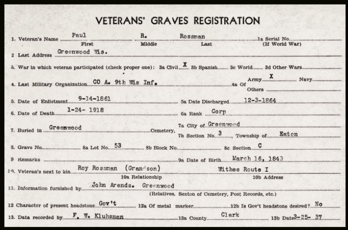 Paul Rossman died last Thursday at his home in Greenwood at age 77. He was a veteran of the civil war and is survived by his wife and daughters: Mrs. Lida Cochran, Mrs. Lily Cochran, Mrs. Nelda Nutting, all living out west; and Mrs. Darton of Loyal, and sons: Alfred, in Montana and William and Paul of Greenwood. He was uncle to E.J. Rossman and of Fred and Julius Rossman. A few years ago he served as deputy clerk of court under Fred Draper, and served as member of the county board for years. In years gone by when his brother Jake, ran the Rossman hotel here, where the Merchants now stands, he was in Neillsville more frequently, and leaves many old friends.