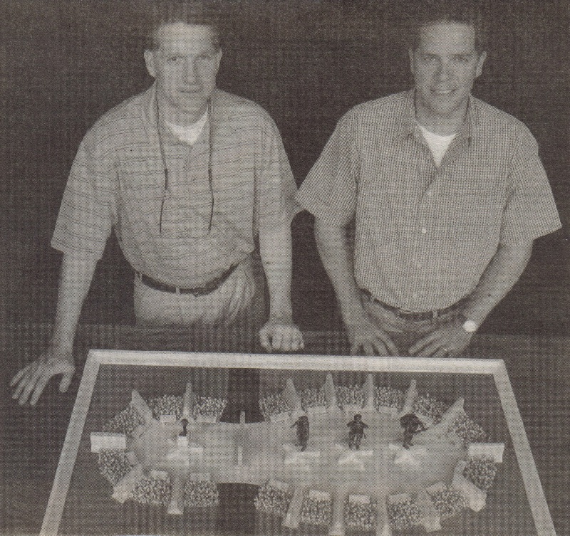 Steve Jamroz (left) and Steve Romatz of the Blue Design Group of Hortonville pose with a Bootprint Design they created for The Highground?s Persian Gulf Tribute. The Highground held an open house Saturday, June 4, to announce the design. (Contributed photo)