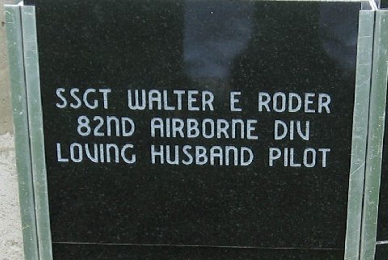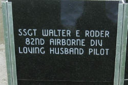 The inscription was written by Marimae Roder, Wally's widow. She lives in Sun City, AZ, and couldn't be here. Wally was quite a guy.......he was an airplane engine mechanic in the war and went on to build a couple of his own planes which he enjoyed flying over the AZ desert. They never had any children.