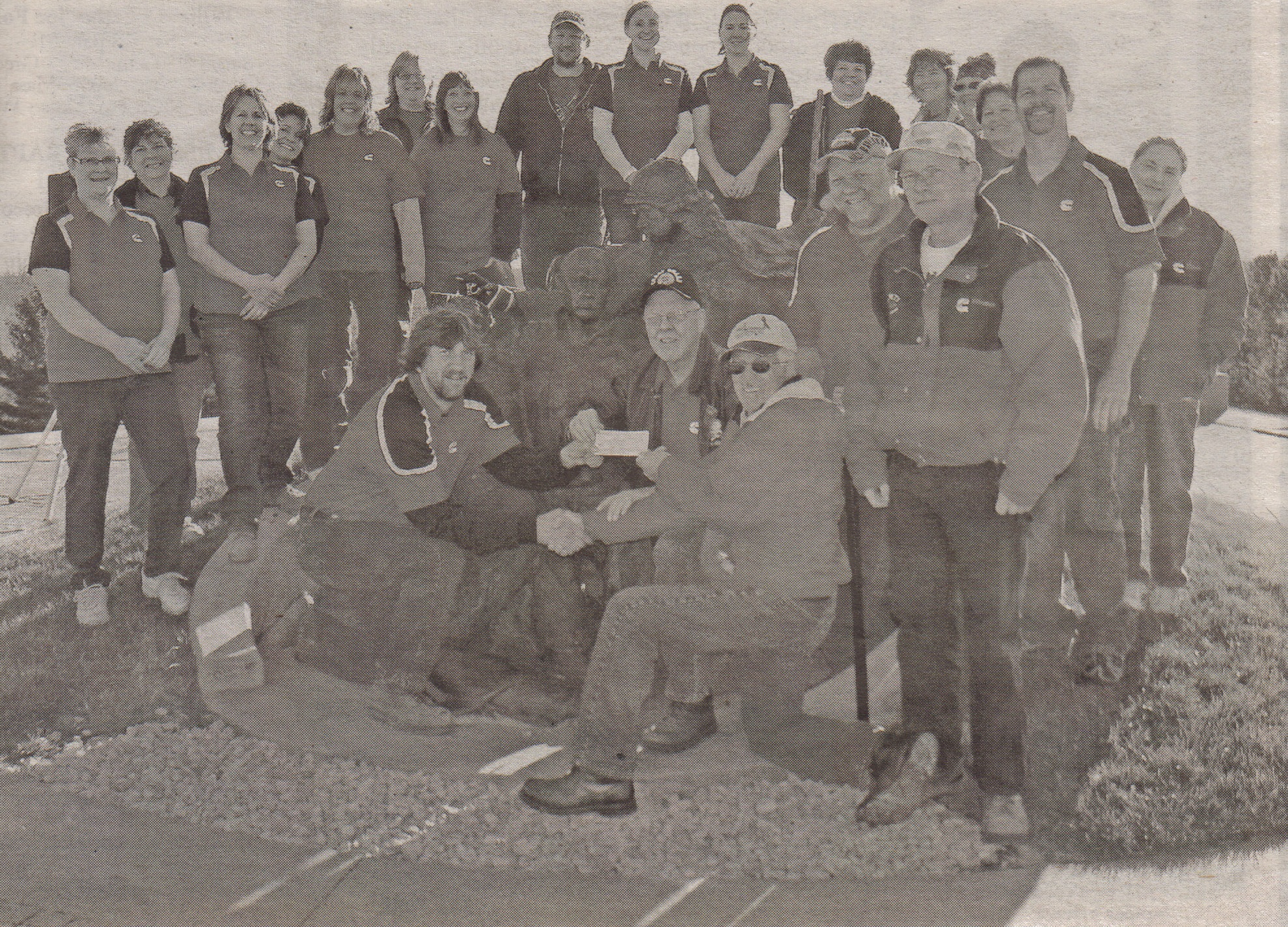 Neillsville Cummins Filtration ?E Team? employees present Highground Volunteer General Manager Kirk Rodman (right kneeling) a $1,000 check Nov. 11 to pay for a Learning Center Lighted sign. The Cummins employees then volunteered time to rake leaves and help with other cleanup projects. (Contributed photo)