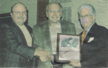 Kirk Rodman presents Bruce Hadler (left) and Pete Rinka (center) of Loyal American Legion Post 175 with the Friends of The Highground Award; each has won the award three times.