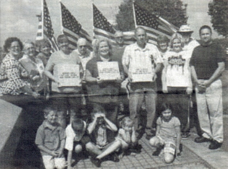 A record number of Legacy stones were placed Sept. 12 at The Highground. Julie Miller (left), holding stone recognized her father, Bernard Maass, with a stone; Suzanna Lau (center) honored her father, Gerald Maass, by placing a stone; Bill Speich holds a stone recognizing his father, John Speich, pictured standing between Miller and Lau. Family and friends of those recognized are also pictured. (Contributed photo)