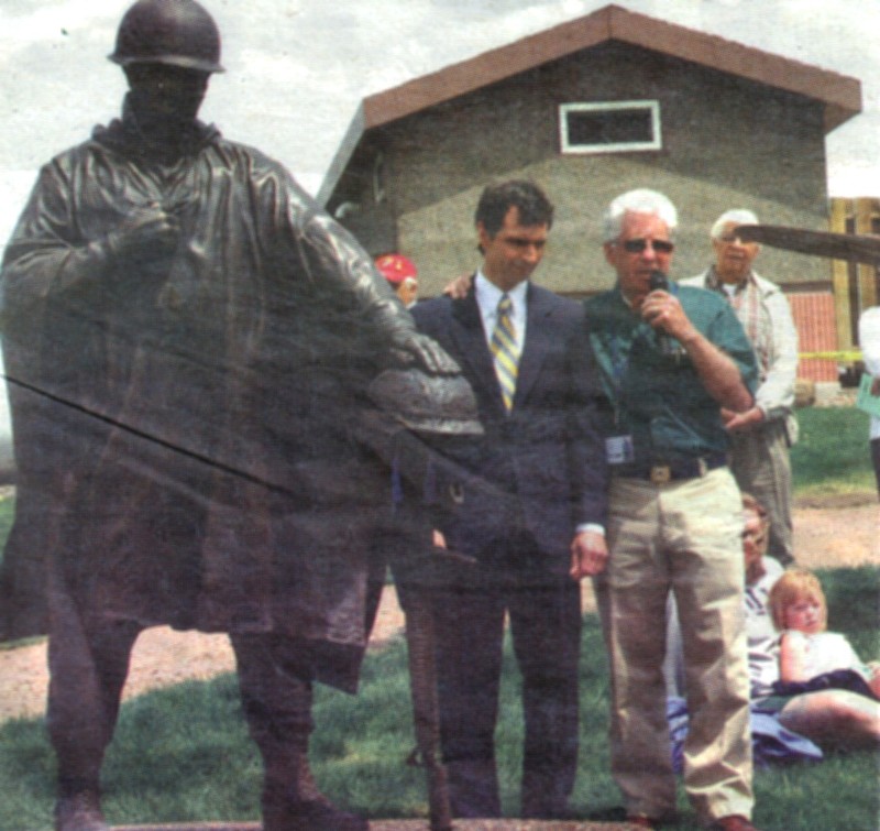 Highground Volunteer General manager Kirk Rodman (R) discusses the GI soldier statue, part of the Meditation Garden, while posing with Michael Martino (L), who sculpted the Fountain of Tears Statuary. The GI, as well as the GI’s wife and child statue, was dedicated as part of the Highground’s Memorial Day celebration held Monday, May 25, 2009. U. S. Representative Ron Kind, USDA Rural Development acting State Director Lori Wells, State Senator Pat Kreitlow and The Highground Board of Directors were among those in attendance.