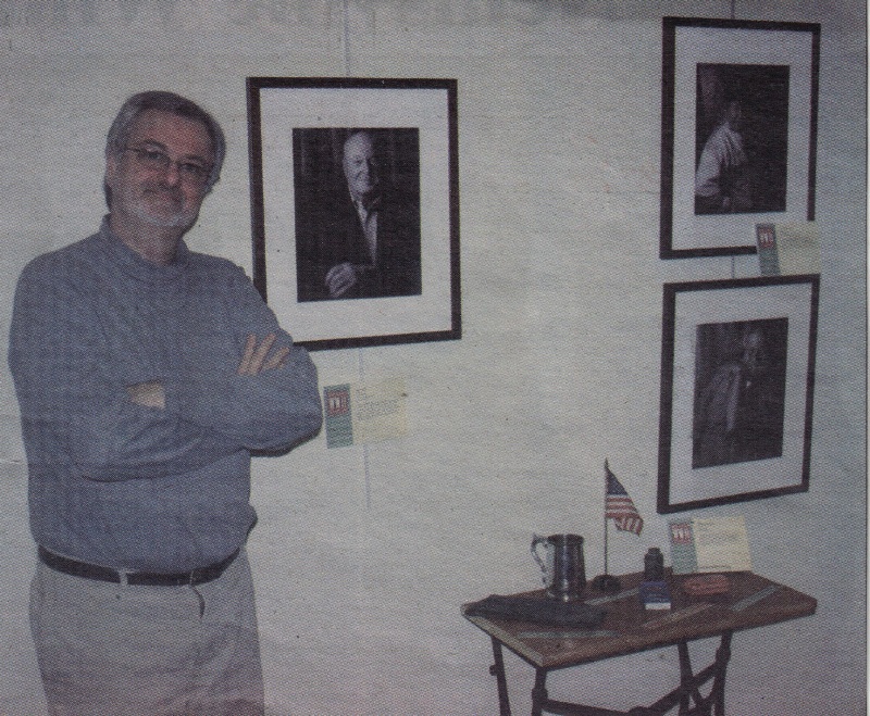 Madison resident James Gill, who has been a Wisconsin Public Television photographer since 1980, poses Wednesday, Feb. 23, at the Highground’s Learning Center with several of his World War II portraits that are being displayed at the Learning Center throughout March. World War II memorabilia will also be displayed at the Learning Center this month.