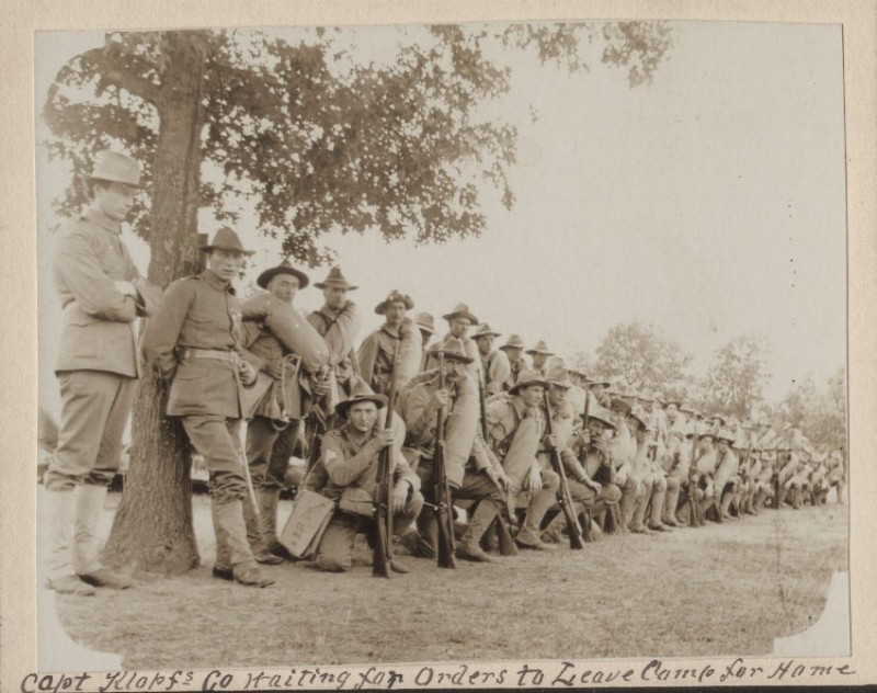 Capt. Henry Klopf's Co. Waiting for Orders to Leave Camp for Home Contributed by Clark County, Wisconsin Jailhouse Museum Estimated date of photograph between 1902 -1920. Henry W. Klopf was born in 1856 in Brooklyn, N. Y. At an early age he left the East, settling in Sheboygan where he learned the trade and was in the jewelry business. In the next few years, he was in St. Paul, and from there came to Neillsville for a visit. Leaving Neillsville, he started a business at Owatonna, Minn. In 1877, he left, coming to Neillsville to start a jewelry business.