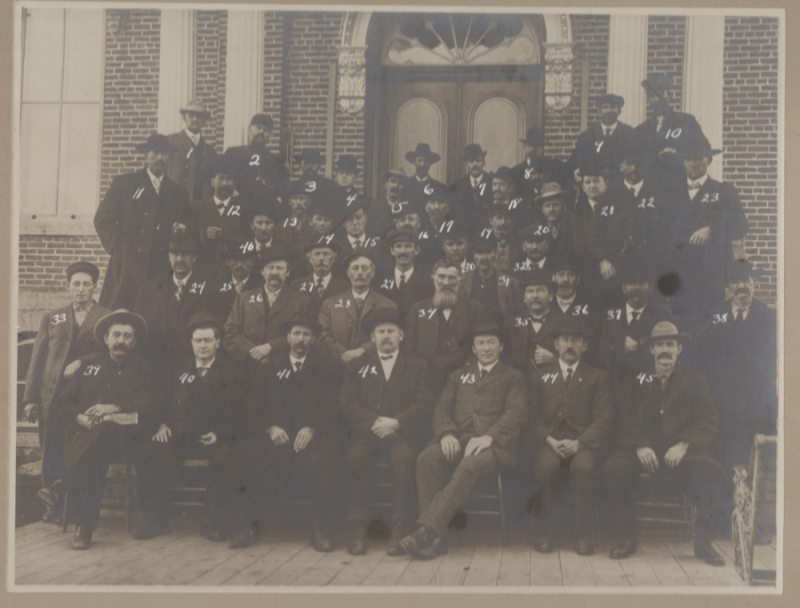 This photograph is a group of important men. The ones that have names have the following in common: members of Masonic Order or Lodge, and a few are attorneys. This photograph had to be taken before 1915, as Homer Clark passed in 1915 at the age of 39 yrs. Seeking additional information on this group of men, please contact Crystal Wendt.