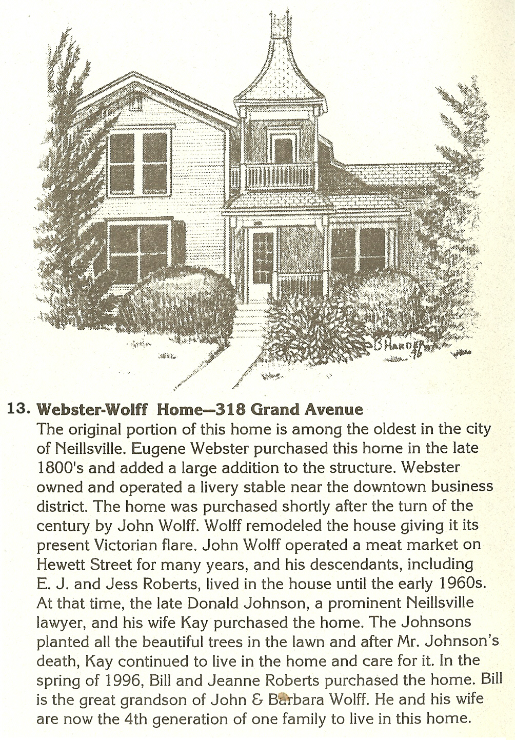Contributors: Cecily Cook, Judy Hansen, Dolores Kenyon, Carol Mitte, Neillsville Historic Preservation Commission, Erdine Payne, Bill Roberts.