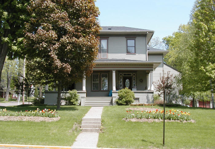 11. C. C. Sniteman House (1915-1917)-319 Hewett St. C. C. Sniteman was a graduate of the Philadelphia College of Pharmacy. He had been encouraged to seek a cool climate since he suffered from malaria. For 61 years Sniteman filled prescriptions until his death in 1940 at the age of 91. Sniteman commissioned Chicago architect George Awsumb to design his home. Awsumb's talents had already been observed with his design of the Neillsville Carnegie Library. His intent was that the library and the Sniteman house were to be harmonious in nature. The Sniteman house is a fine representation of Prairie Style architecture. This home is currently (2007) owned by Jess and Pat Johnson. |