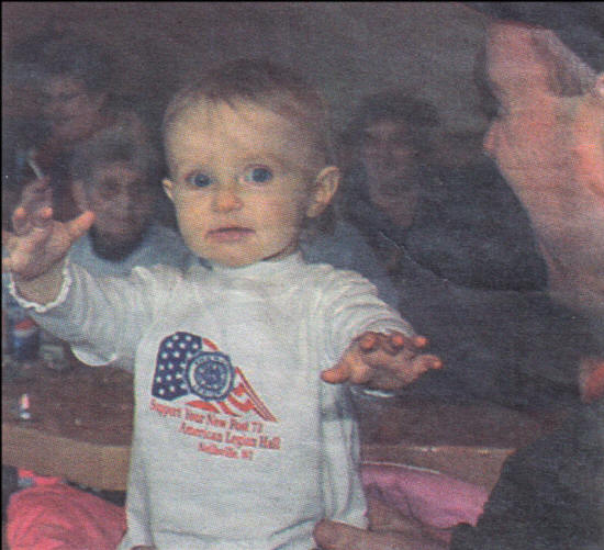 In making the ribbon-cutting and other events at the new Neillsville American Legion Hall and community center a part of her first birthday, Abigail Koepp, shows her enthusiastic support for the occasion. The daughter of Jason (at right) and Lisa Koepp, she just happens to have Legion Commander Rick Thoma as her grand-dad. |
