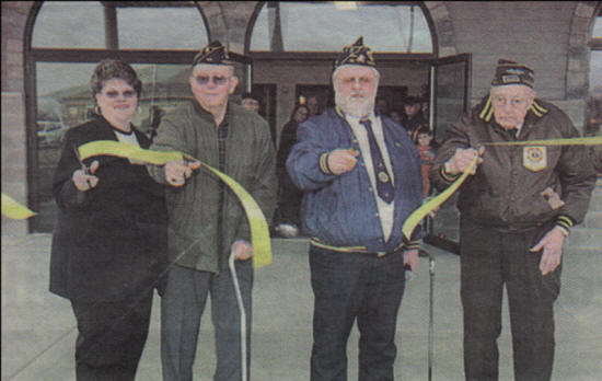 Taking part in the official ribbon-cutting ceremony in front of the main entrance of the new Neillsville American Legion Hall and community center were (from left to right) Neillsville Mayor Diane Murphy, long-time Legion Member Pink Van Gorden, Legion Commander Rick Thoma and Ernie Gaden who, at 93, is the oldest of the legion members. |