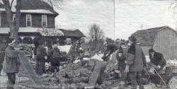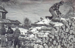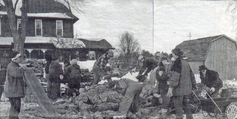 Not sleigh bells ringing, but chainsaws buzzing, as 16 members of the Neillsville Saddle Tramps recently cut, split and stacked about five pulp cords of wood to help a fellow member facing health issues prepare for cold winter weather. After three hours of work, not ?horsing around,? members enjoyed a potluck meal. Above Steve Barrette manned the chainsaw, while (l-r) Brad Goetz, Carla McNeely and Mary Ann Gaul handled the splitter. Below, everyone worked hard to finish in three hours. Anyone interested in joining Saddle Tramps may contact Bekke Barrette at 715-743-4892 or Sue Poziombke at 715-743-4806. (Contributed photos)