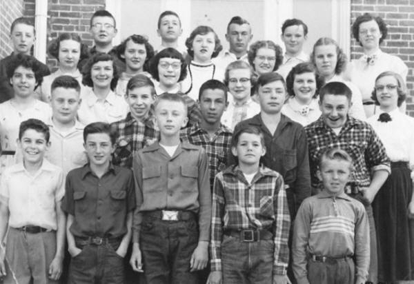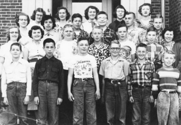 Row 2: Mary Manz, Lois Howard, Don Campbell, John Moen, Ellis Stoll, Tom Meier, Mrs. Angie Schultz, teacher
