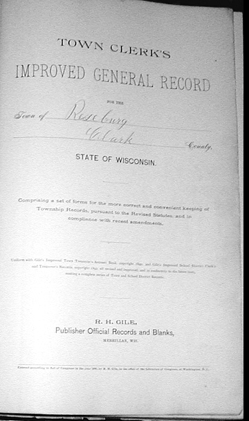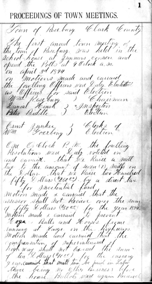 he first annual town meeting of the town of Reseburg was held in the school house at Zimmer's corners and opend the polls at 9 O'clock a.m. on April 3rd 1894 on motions made and carraid the fowlling officers were duley elected as officers for said election