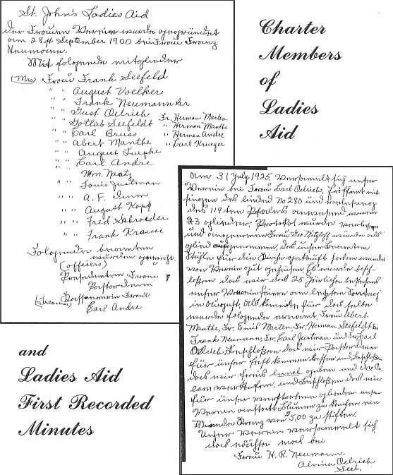 St. John’s Ladies Aid Society The St. John’s Ladies Aid Society was founded in 1900 with 20 charter members. There were no written minutes until 1925. These were written in German and will be found in this book. The function of the ladies aid was to provide an opportunity for the ladies of the congregation to have a day of fellowship, Bible study, and provide services to the church when needed. Throughout the years they have done a great many tasks and contributed to the welfare of this congregation. They have purchased many items such as Bibles, Sunday School hymnals, hymnals for the congregation, Bible Dictionaries, Good News for Shut-ins, all the kitchen appliances (of which most have been replaced at least one time) and utensils; gave toward the organ and building funds, repairs, remodeling and decorating the parsonage a number of times, and kept up the cleaning and repair of the school in cooperation with the congregation. It is of interest to note that the altar, pulpit and baptismal font were purchased by the Aid in 1910. These were done with monthly dues, projects, donations and memorials from deceased member’s families. Projects were dinners, bazaars, bake sales, cook a book sales, vanilla, spices, cards, wrapping paper, and napkin sales to mention a few. With proceeds from these, various mission and charitable organizations were sponsored along with home uses. The Lutheran Hour Sponsorship plan was adopted in 1961. The Concordia Seminary Guild was supported starting in 1963. The Lutheran Medical Mission Society was helped from 1961 - 1976. The providing of Portals of Prayer free for member’s home devotion was begun in 1958. Then in 1976 it was extended to include some large print Portals of Prayer. Altar flowers are funded by the Aid for special services and on communion Sunday. This has been done since 1955. The children in VBS have been given ice cream for the last day’s treat since 1954. We have been providing Christmas gifts to servicemen and shut-ins since 1956. The circuit pastor’s monthly study club is served lunch when it meets here. Members celebrating their Golden Wedding Anniversary are given devotional books. Pastor’s vestment gowns have been given to the two sons of the congregation, Wilbur Neumann and Richard Klein. Richard was given stoles at his ordination celebrated here in 1971.