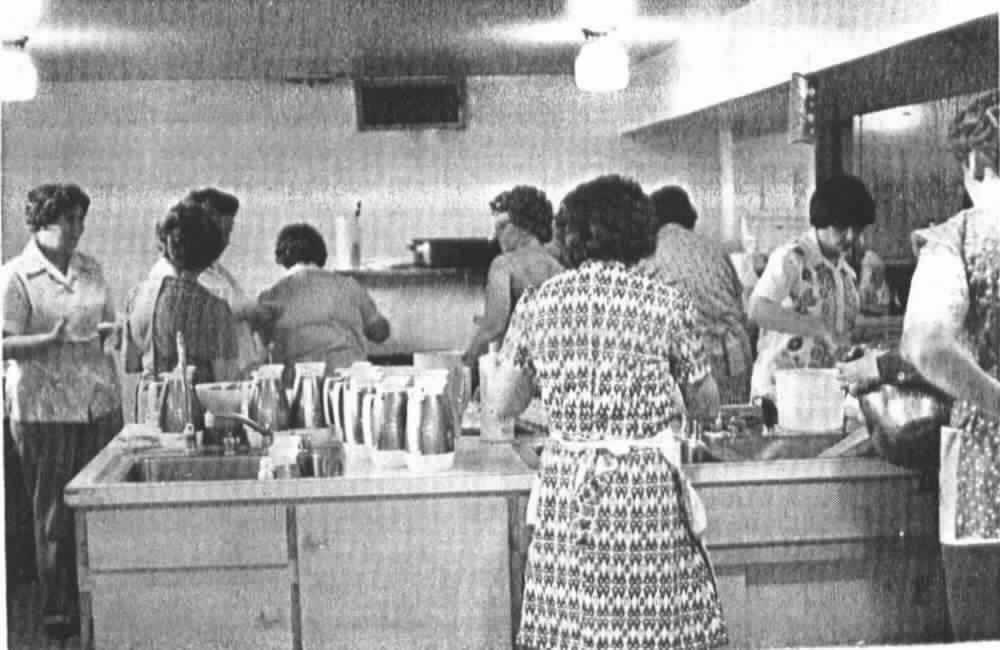 Working for the Pancake Supper - 1977 There are also annual functions such as serving the mission fest dinners or lunches. There is a Christmas party when visitors and/or spouses are asked to celebrate with us. A gift of money is sent to a charity such as Bethesda Lutheran Home, American Bible Society, Lutheran Children’s Friend’s Society or The Lutheran Hour. A clothing drive is also held in the fall and occasionally a quilting day or two is held for World Relief. This is done in cooperation with the LWML group. Last year 15 quilts and 13 layettes were sent. Other services rendered are lunches or dinners served for ordination, dedications, funerals, installation receptions and any other special occasions. Gifts of food, money, and clothes were sent to Europe during the war period. Relief was given to a family who were victims of a tornado. Activities that we have had include trips to Bethesda Lutheran Home in Watertown, Wisconsin, Northern Colony near Eau Claire, participation in a few World Day of Prayer services held in local churches. We also had the pleasure of veiwing slides of Canada where Pastor Klein has been serving. A display of tracts and literature put out by the American Bible Society was put out at the Spencer Centennial and is now kept in the narthex for anyone who desires to help themselves. Notes of interest are several. The first meetings were, of course, in the German language until 1933. Then a mixture of German and English until 1936. The meetings were held in homes and at the church, whichever the hostess preferred until sometime between 1936 - 1940. Sugar and coffee ration cards were sent for in 1942. Two pounds per month of sugar was our quota. Prices set for dinners served were subject to some inflation as the rest of our economy has been. In 1941 25 cents and 15 cents, in 1961 25 cents per plate if the food was supplied, if not the price was $1.50. It increased to $2.50 in 1970 and to $3.00 in 1976. One Mother-Daughter banquet was held in 1963. A father-son banquet was held the next year. The constitution was revised, in 1960 and 1976. One surprise baby shower was given for a pastor and his wife, in 1974. The fortieth anniversary was celebrated with a service and then a chicken dinner was served. All members were asked to donate and the Aid prepared and served the meal. At the 75th anniversary they had 2 special meals and sold anniversary plates. The Aid usually had some kind of welcoming shower or gift for a newly arriving pastor and his family. Pastor Ruhbusch served as a vacancy pastor 1968 - 1969 serving also the Aid. The flower beds beside the church entrance until the new addition was built on in 1961 was the responsibility of the Aid. The Aid was part of a committee to take care of the landscaping around the new building. As this interested person went through the records to prepare this report she was amazed at what has been accomplished through this organization. I hope every person who has ever wondered what purpose or gain can be accomplished in being a member will read very carefully. It wasn’t just one group that accomplished all this but several people over many years. It’s not to be a glory seeking group but to serve. And that is what the Aid has done. The purpose of going into some lenghth of the services rendered was not to brag but to be somewhat of a messenger to those who wonder how they can serve in their church. I feel it is quite apparent that our church would not be quite as blessed as it has been these 100 years had it not been for these many dedicated members of the Ladies Aid Society.
