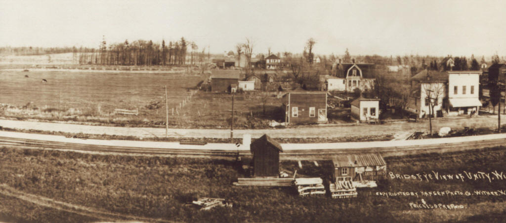 "In the foreground is the building for the section crew to store their tools and handcar in. Across the street are two small buildings that I don't know. The tall white one on the right is Groelle's store. The house behind that with the barn shaped roof is Alfred Cook's new house. The farm behind that is Alfred Cook's old house and barn." Comments by Al Gurtner, Unity Historian