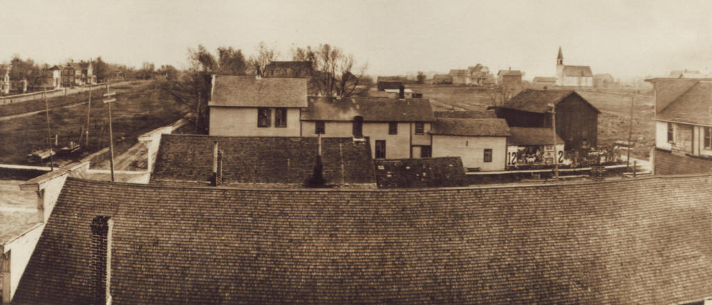 "This Picture is a view looking South and in the foreground is the Opera House. Next is Creed Bros. store. The big, 4 layered building next is Laabs' Saloon and Misener barber shop. Big building at far left is the Nelson Hotel owned by Chris and Stine Nelson. Lastly way to the right is the first version of Trinity Lutheran Church, named the Swedish Church. It was blown over in a tornado, and set back upright with a few teams of horses."