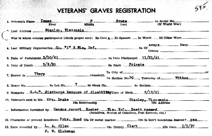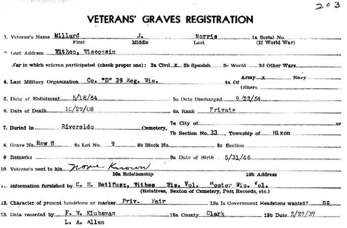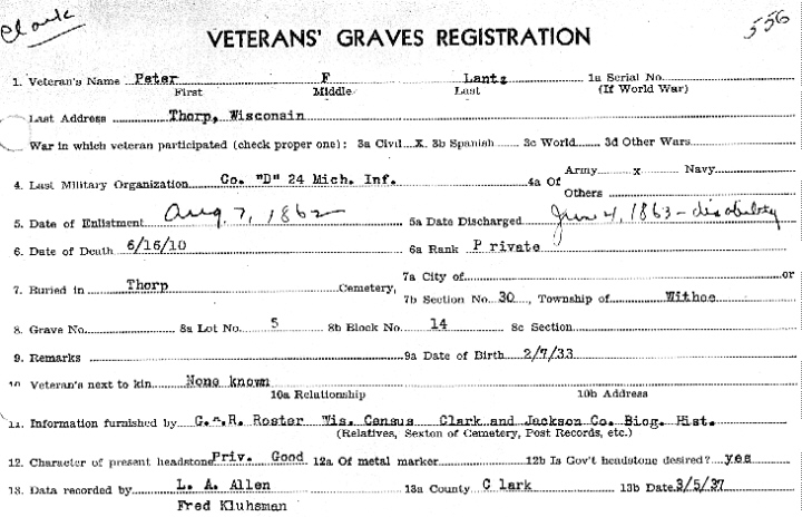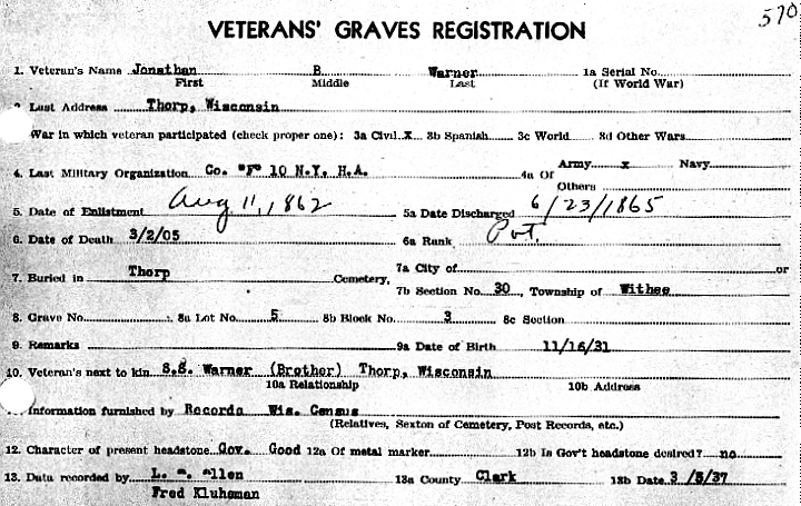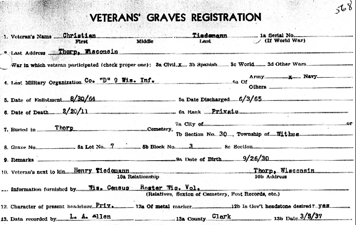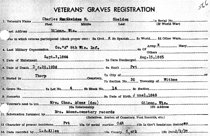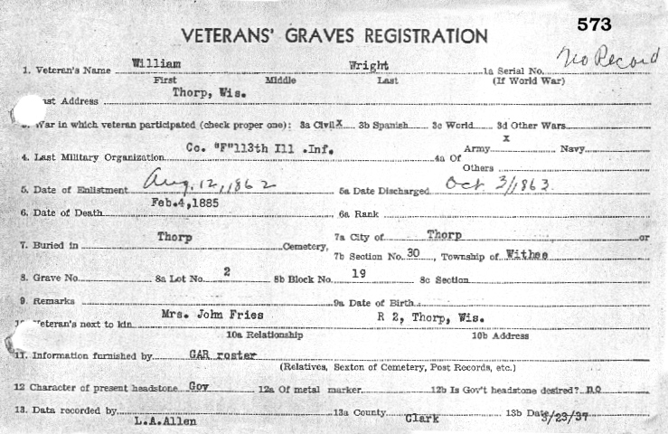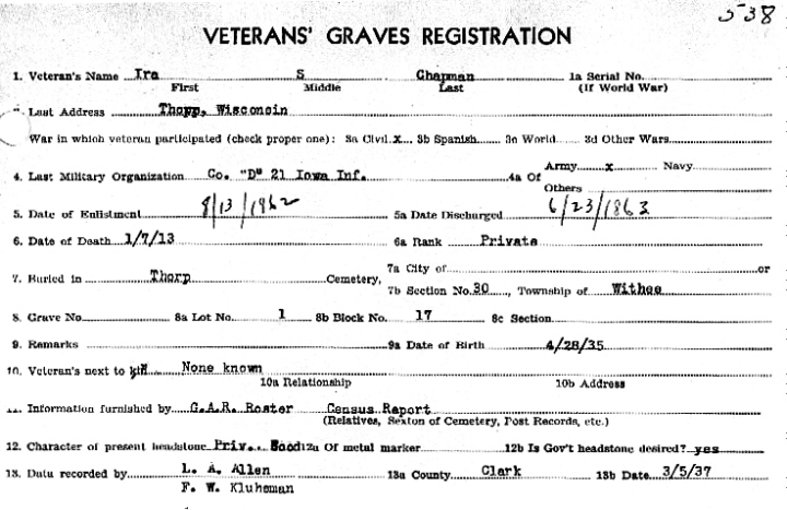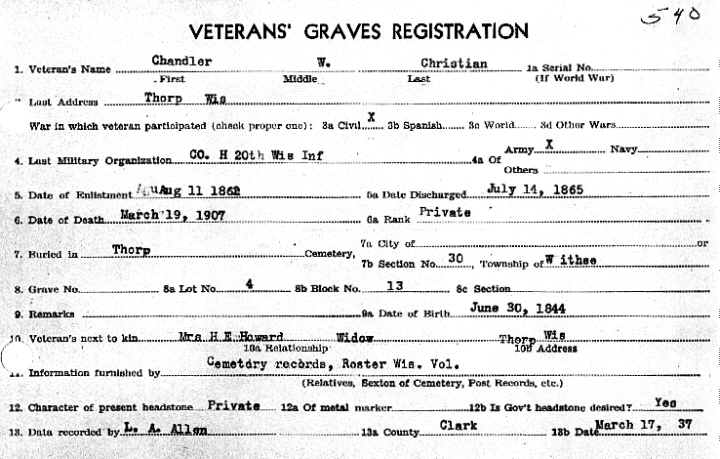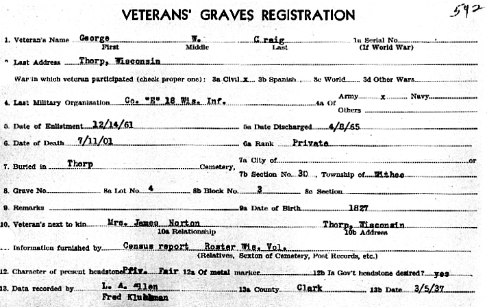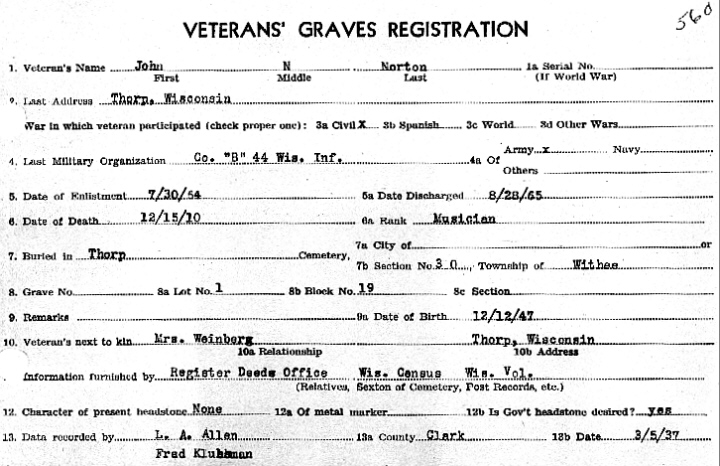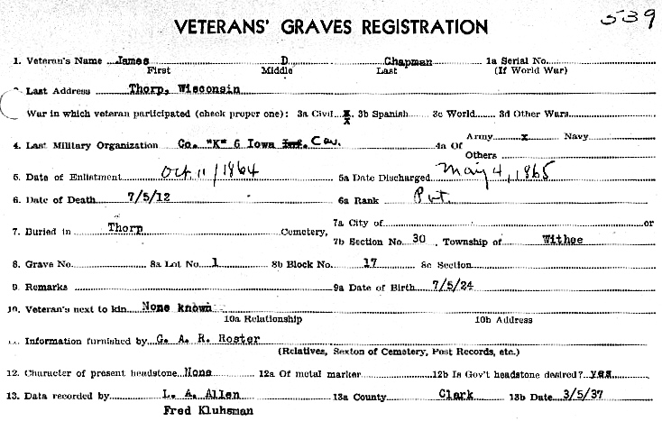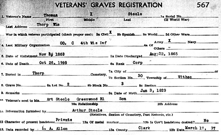 A new stone was ordered by the Thorp American Legion, but denied. We hope to have the existing stone engraved to denote his Civil War service. |