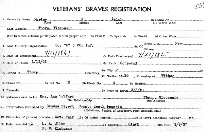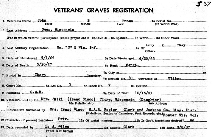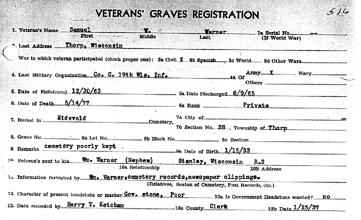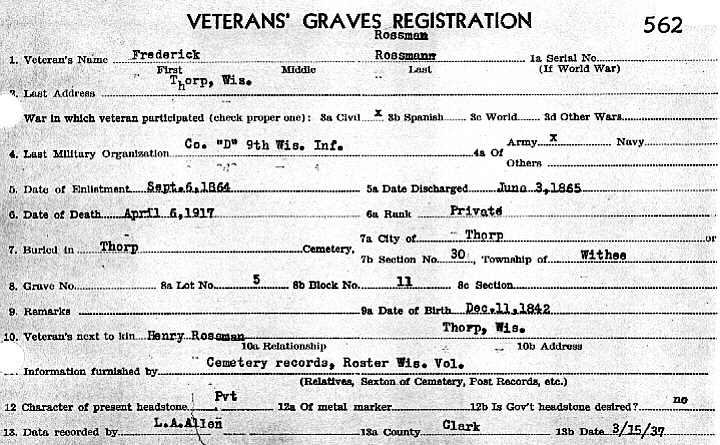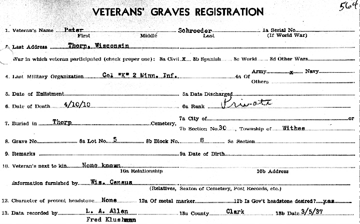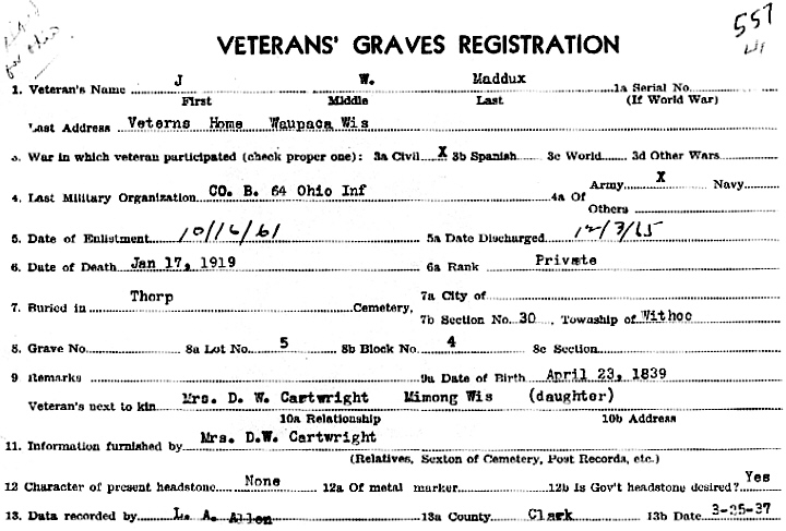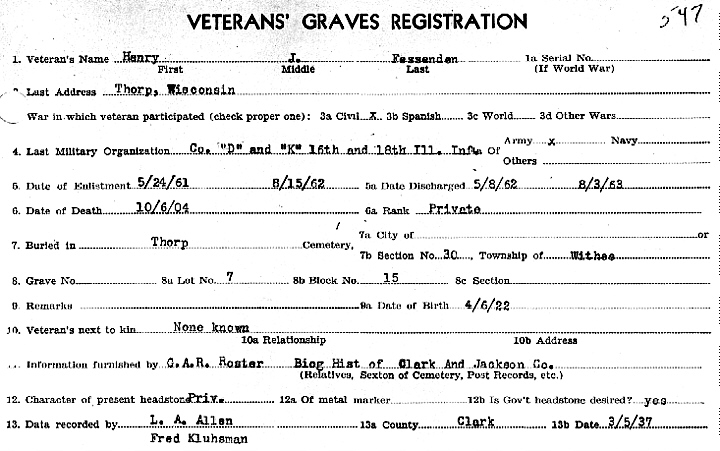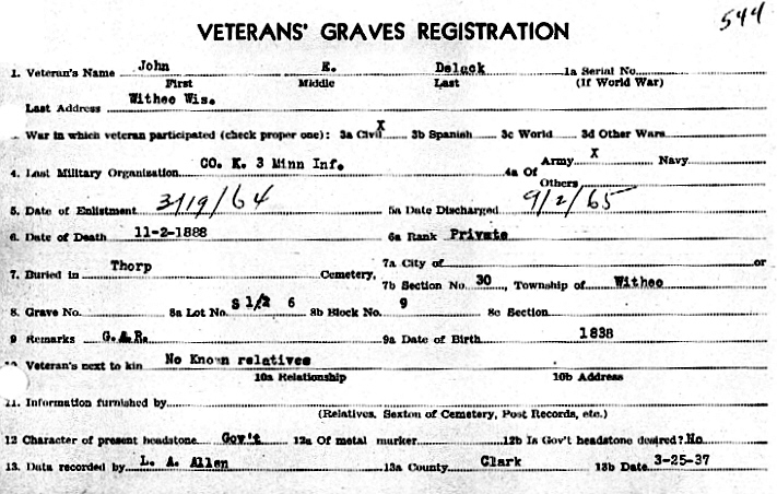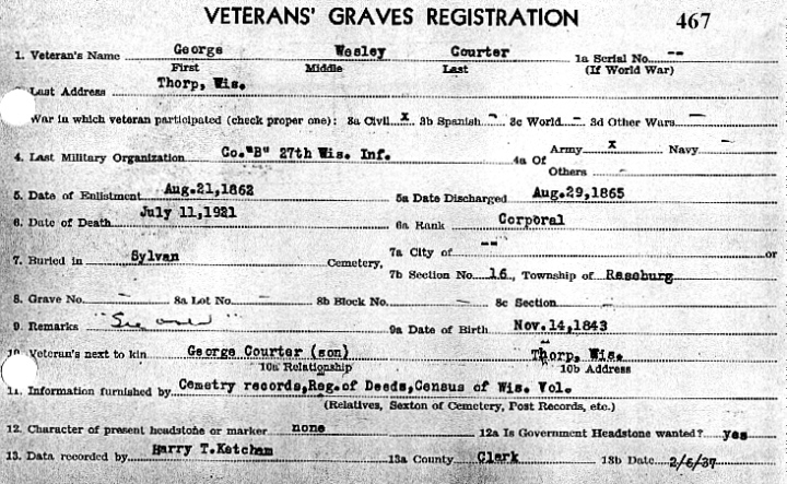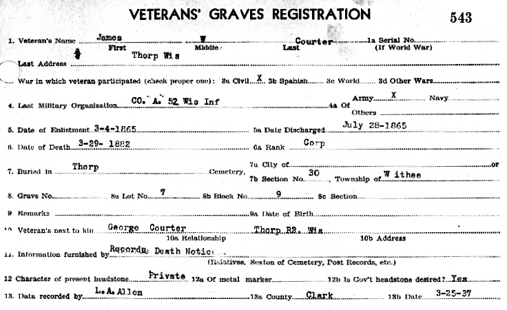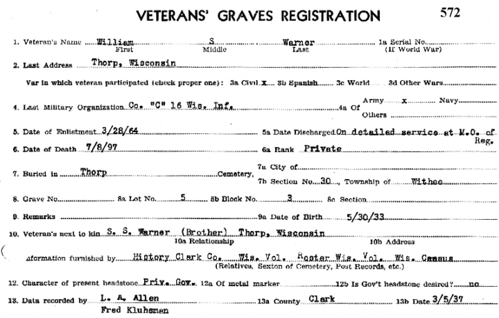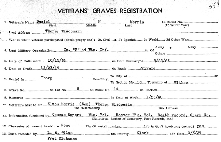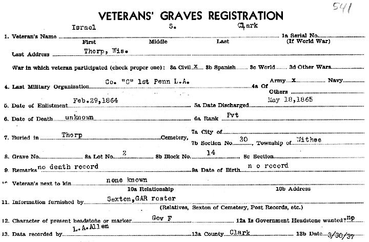 A new stone was ordered by the Thorp American Legion, but denied. We hope to have the existing stone engraved to denote his Civil War service. |