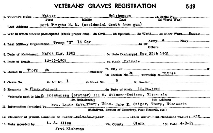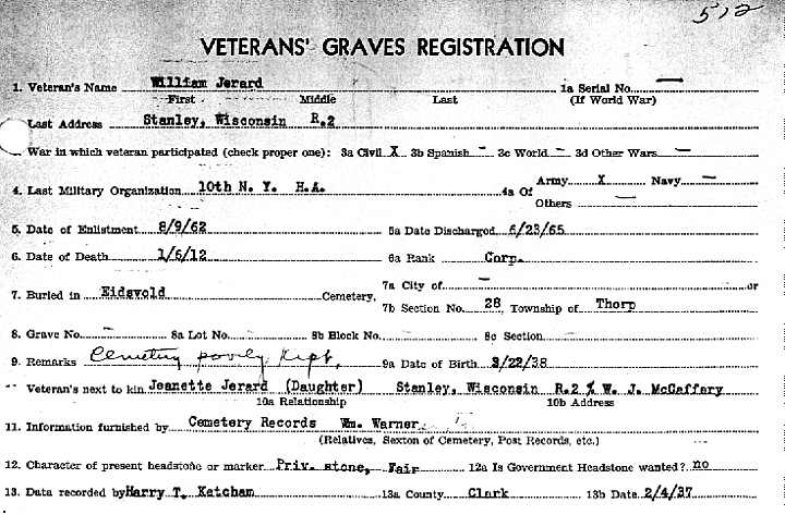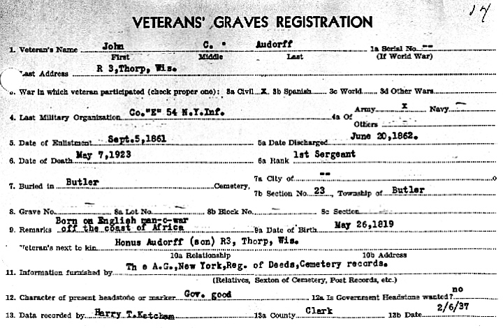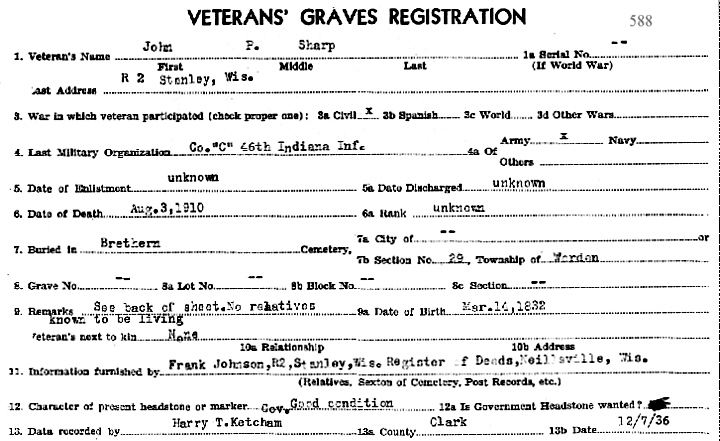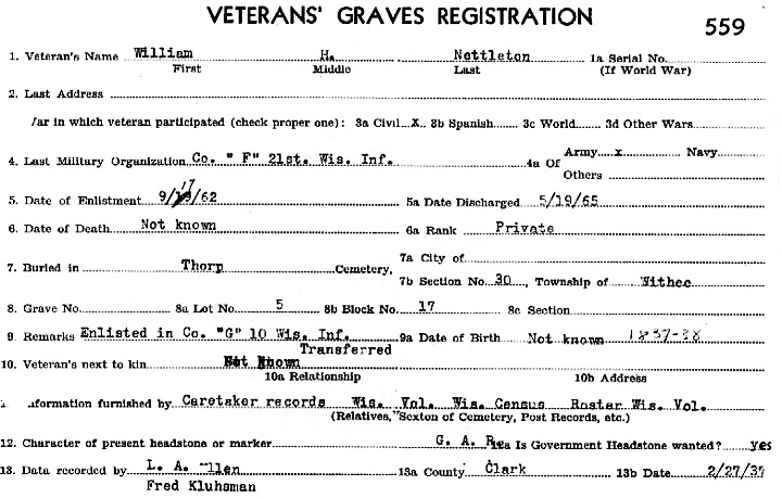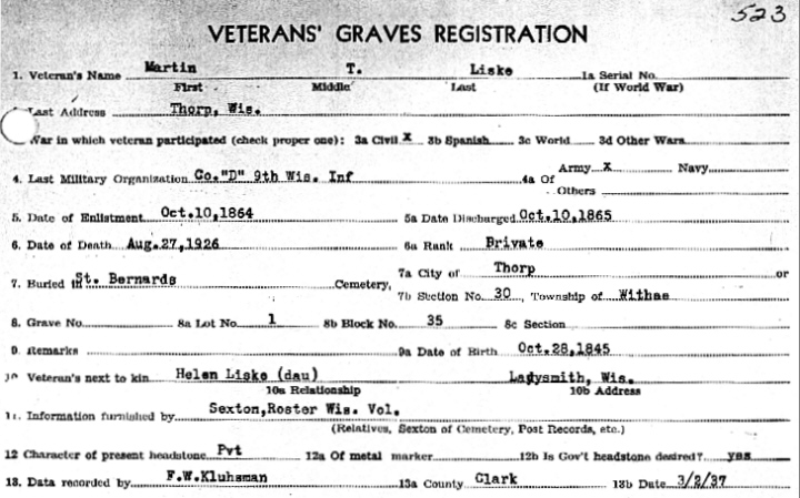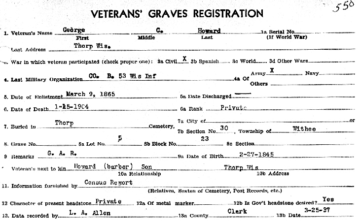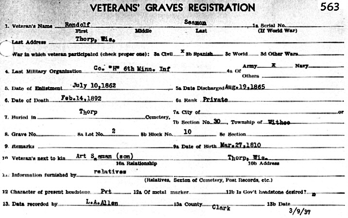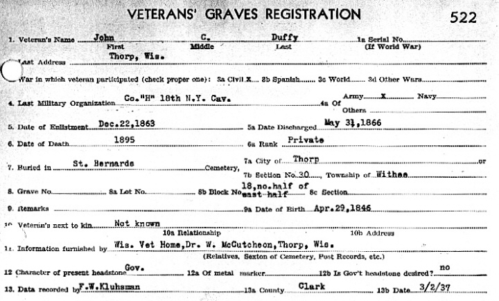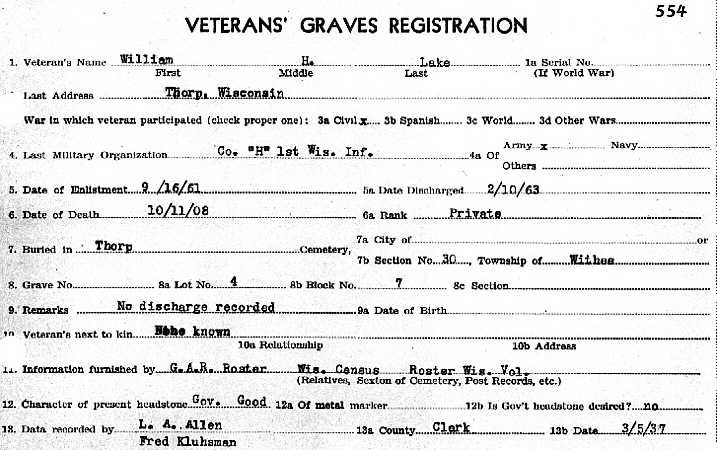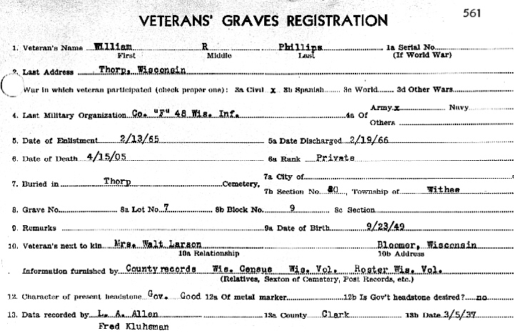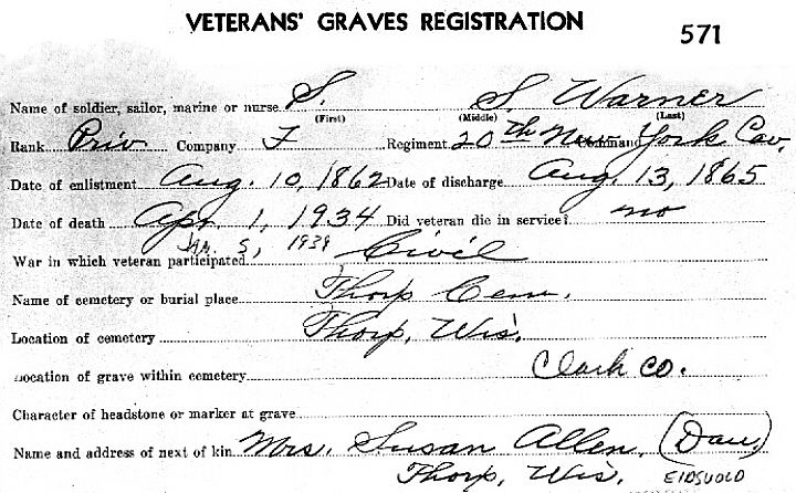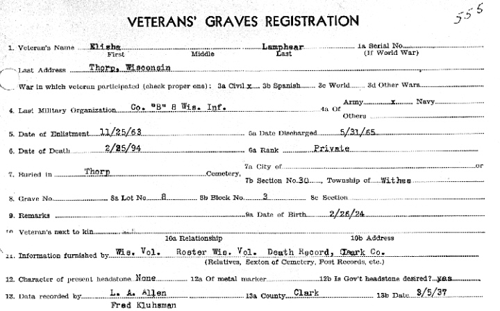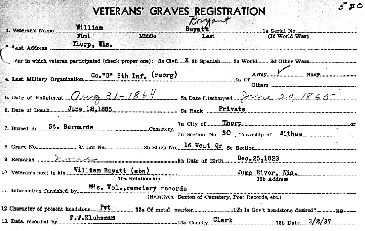 A new stone was ordered by the Thorp American Legion, but denied. We hope to have the existing stone engraved to denote his Civil War service. |