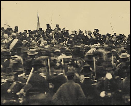 One of only two confirmed photos of Lincoln (center, facing camera) Taken about noon on November 19, 1863; at Gettysburg. Lincoln spoke some three hours later. To Lincoln's right is Ward Hill Lamon, his bodyguard |