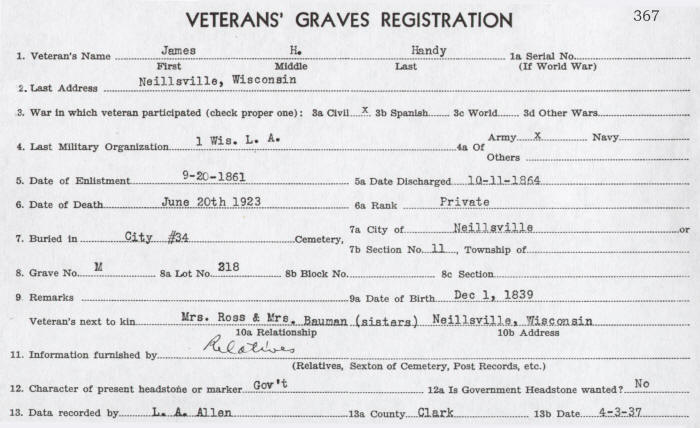 | Ludington | George A. | NEILLSVILLE CITY | PINE VALLEY | 1842 - 1922; Co. H, 30th OH Inf.; PVT; 13Sep1861-13Aug1865; VGR#391; Obit | 5 OCT 1839 - 1 FEB 1908 | Mrs. Harry Bradway of Cambridge City, IN & A.E. Brown |