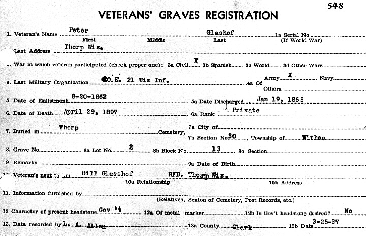 | Glasshof | Peter F. | E. THORP VILLAGE | WITHEE | 1843-1897; Co. E, 21st WI Inf.; PVT; ser: 8/20/1862 to 19 Jan 1863, VG #548, Lot 2, blk 13, Inf. Bill Glasshof of Thorp; Bio; Obit | 19 MAR 1844 - 29 APR 1897 | |