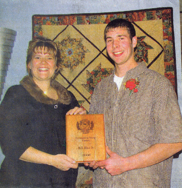 Bill Rice Jr. is the Outstanding Young Farmer in 2006. Kari Skibbie presented the award during the Jaycees banquet held at Cindy’s Banquet Hall November 4, 2006. Bill met the requirements of being in the district, contributing to the community and being involved in water and soil conservation, just to name a few. Bill graduated with the Thorp class of 2000. From there he went on to earn a degree at the Chippewa Valley Technical College and has worked the family farm since graduating. Bill is currently milking 62 Holstein cows and grows hay, soybeans and corn.
