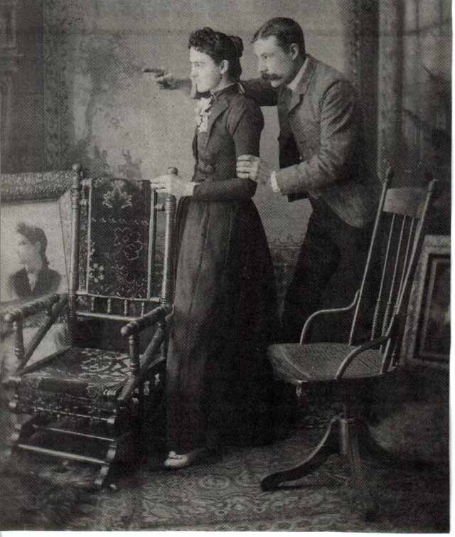 Recently, Janet Rogalski brought in a set of photos to our office taken by a T. J. Jones, who once had a photograph studio in or around Thorp.  The first of these photos shows a couple in fine, old clothing, at their house.  The man is pointing off towards the left, where the woman is looking.  Pictures and chairs are also scattered in the room with the two.  All that is known is that these two are Mr. and Mrs. Monroe.  Does anyone know who these people are, and about when the photo was taken?  Do you know anything about T. J. Jones, the photographer?  Please share any information you have with us, and our readers.