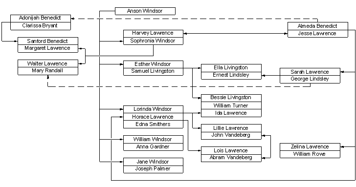 | Jesse Lawrence | Almeda (Benedict) Lawrence | Horace Lawrence | Sarah (Lawrence) Lindsley | Zelina (Lawrence) Rowe | Adonijah Benedict |