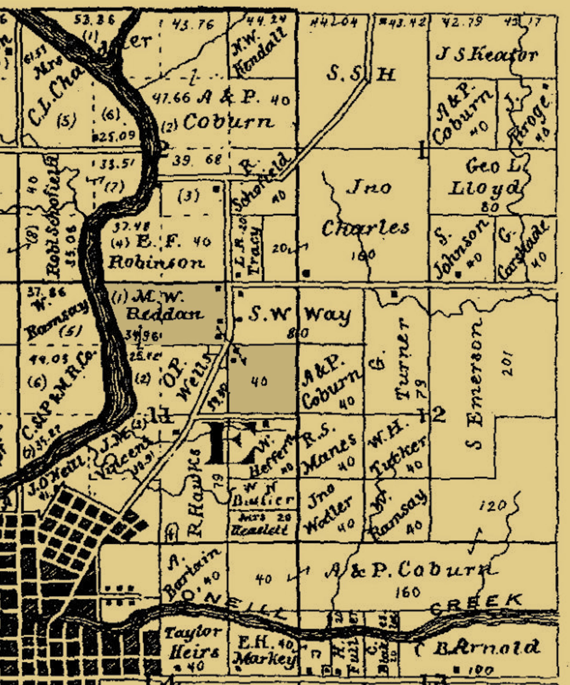 The farm that the sale notice was referring to was most likely the land that was formerly owned by his deceased wife, M. W. Reddan, who again was the widow of Leonard Stafford. The excerpt of the 1880 Pine Valley Township plat map at the top of this page shows a M.W. Reddan owning two parcels of land in Section 11. In addition, this 1880 plat map excerpt shows about four buildings still existing in a location where the corners of these two parcels intersect. The intersection of these parcels is probably where Staffordville was located. The arrow in the title of this page points to that location.