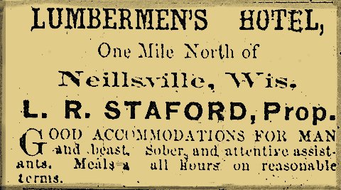 Therefore, based on Census data and also the Clark County Republican advertisement (on the left), Staffordville probably consisted of a hotel (with a barber shop), a general merchandise store, a wagon/blacksmith shop, a harness shop, and a saloon; anything and everything for the wants and needs of a 19th century lumberman.